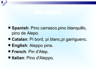 The document summarizes information about the Aleppo pine tree, including its native region in the Mediterranean, typical altitude range up to 1000m, family and order classification. It describes the tree's trunk and bark as orange-red and thick at the base but thin and flaky in the crown. The leaves are very slender needles produced in pairs that are distinctly green. The cones are narrow, cone-shaped and broad at the base when closed, turning from green to glossy red-brown when fully matured at 24 months old.