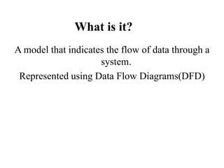 The document describes data flow diagrams (DFDs), including what they are, their purposes and uses, and the different types of DFDs. DFDs show the flow of data through a system and are used to model systems for requirements analysis, design, documentation and more. They contain processes, data stores, external entities and data flows. The different types of DFDs include context diagrams, level-0 diagrams, and more detailed lower-level diagrams.