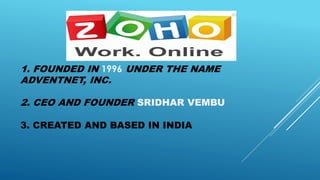 Zoho CRM is a cloud-based customer relationship management tool that was created in India in 1996. It offers customizable and affordable pricing and is user friendly. Key features include managing leads, accounts, contacts, opportunities and marketing campaigns, as well as activities, reports, dashboards, documents and mass emails. It integrates with other Zoho apps and can be accessed from mobile devices. Pricing starts at $12 per user per month.