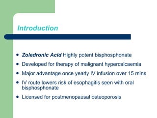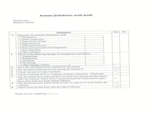 This audit summarizes the current practice of zoledronic acid therapy at NNUH. It found that 73% of patients received zoledronic acid for osteoporosis. Most patients had previously tried other osteoporosis therapies. While most patients received information and supplements, some did not have information fully explained or receive calcium and vitamin D. All patients had creatinine clearance and calcium levels checked. Most were told to drink water before and observed after the infusion, though a few were not. The audit concluded areas of current practice that could be improved.