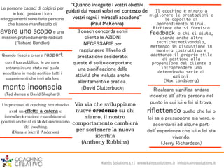 Il documento discute il coaching come un processo collaborativo orientato ai risultati, enfatizzando l'importanza di obiettivi chiari e allineamento tra valori e identità. Illustra come il coaching possa migliorare le prestazioni individuali e di gruppo attraverso il feedback e il supporto, utilizzando tecniche di ascolto e adattamento. Viene inoltre sottolineato il ruolo fondamentale del coach nel facilitare il cambiamento e la crescita personale dei clienti.