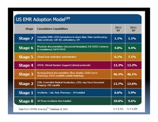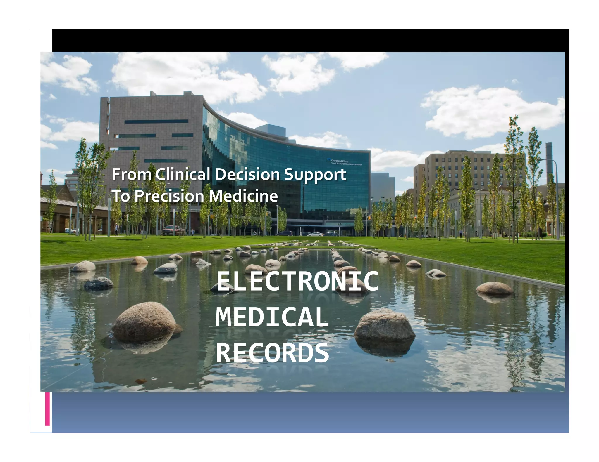 The document discusses Cleveland Clinic, an academic medical center with 1300 bed main hospital and 9 regional hospitals. It sees over 54,000 admissions and 2 million outpatient visits annually. The clinic has a group practice of 2700 physicians and scientists, and is involved in over 3000 research projects. It operates an innovative medical school and has spun off 30 companies. The document then discusses how electronic medical records and clinical decision support systems can help reduce the 17 year lag time for implementing clinical research results into practice. It provides examples of how EMRs and CDS tools such as order sets, alerts and clinical guidelines can improve patient care, outcomes and efficiency. Registries created from EMR data are also discussed as a way to study conditions, treatments