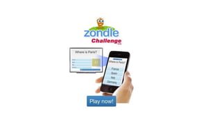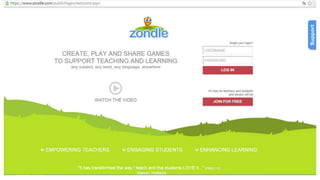 Zondle is a free online and mobile platform that uses game-based learning to engage students and enhance learning. It allows teachers to create questions on any subject or level and incorporate them into over 60 game formats. Students can play teacher-created games to review material and track their progress over time. Research suggests that Zondle's gamified approach can improve memory encoding and knowledge retention compared to traditional methods. The platform provides a large question database and customizable games to help teachers facilitate learning in fun ways.