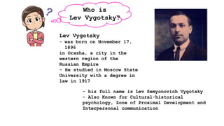 Lev Vygotsky was a Russian psychologist born in 1896 who studied law at Moscow State University. He is known for developing cultural-historical psychology and coining the concept of the zone of proximal development, which refers to the difference between what a learner can do independently and what they can do with guidance and is considered an important aspect of learning. Vygotsky believed that learning precedes development and argued against using tests to measure intelligence alone.