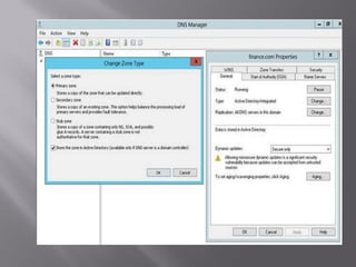 This document summarizes the key components and functions of DNS (Domain Name System) servers. It discusses how DNS servers handle name resolution queries by querying other DNS servers in a hierarchical manner. It also describes different types of DNS zones (primary, secondary, stub) and how they are used. Active directory integrated zones provide benefits like secure dynamic updates and increased resilience through replication. The document concludes by demonstrating how to sign a DNS zone with DNSSEC to verify signatures.