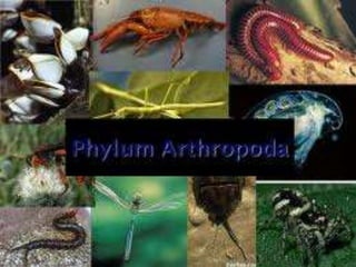 Arthropods are characterized by their jointed exoskeleton and limbs, and segmented bodies. They include insects, arachnids, crustaceans, and extinct groups like trilobites. The largest phylum of animals, arthropods have adapted to nearly all environments. Their success is due to traits like their tough exoskeleton, segmented body, and jointed legs adapted to many modes of life.