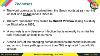 Zoonotic diseases, or zoonoses, are diseases that can be transmitted between animals and humans. They make up around 60% of emerging infectious diseases. Zoonoses can be classified in several ways, including by their causative agent (such as bacteria, viruses, parasites), reservoir host (animals that can transmit the disease to humans), and transmission cycle (direct or requiring multiple hosts). Common transmission routes include direct contact, bites, contaminated food/water, vectors like ticks and fleas, and airborne or fecal-oral transmission. Occupations like farming and veterinary work carry higher risk of exposure. Emerging infectious diseases are on the rise due to factors like environmental changes, antimicrobial resistance, and globalization