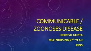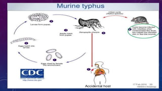 This document provides information on the zoonotic disease Murine typhus. It is caused by the bacteria Rickettsia typhi and is transmitted to humans through contact with infected fleas. Common symptoms include fever, headache, and rash. Murine typhus is endemic in many parts of the world where infected rats and their fleas live in close proximity to humans. Proper sanitation and pest control can help prevent the spread of this disease.