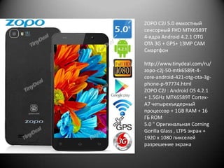 Смартфон Zopo C2J работает на Android 4.2.1 с четырехъядерным процессором MTK6589T и оснащен 5-дюймовым FHD экраном. Устройство поддерживает функции OTG и OTA, встроенный GPS, а также имеет 13 МП камеру с автофокусом. Смартфон совместим с 3G и 2G сетями и предлагает большой набор предустановленных приложений.
