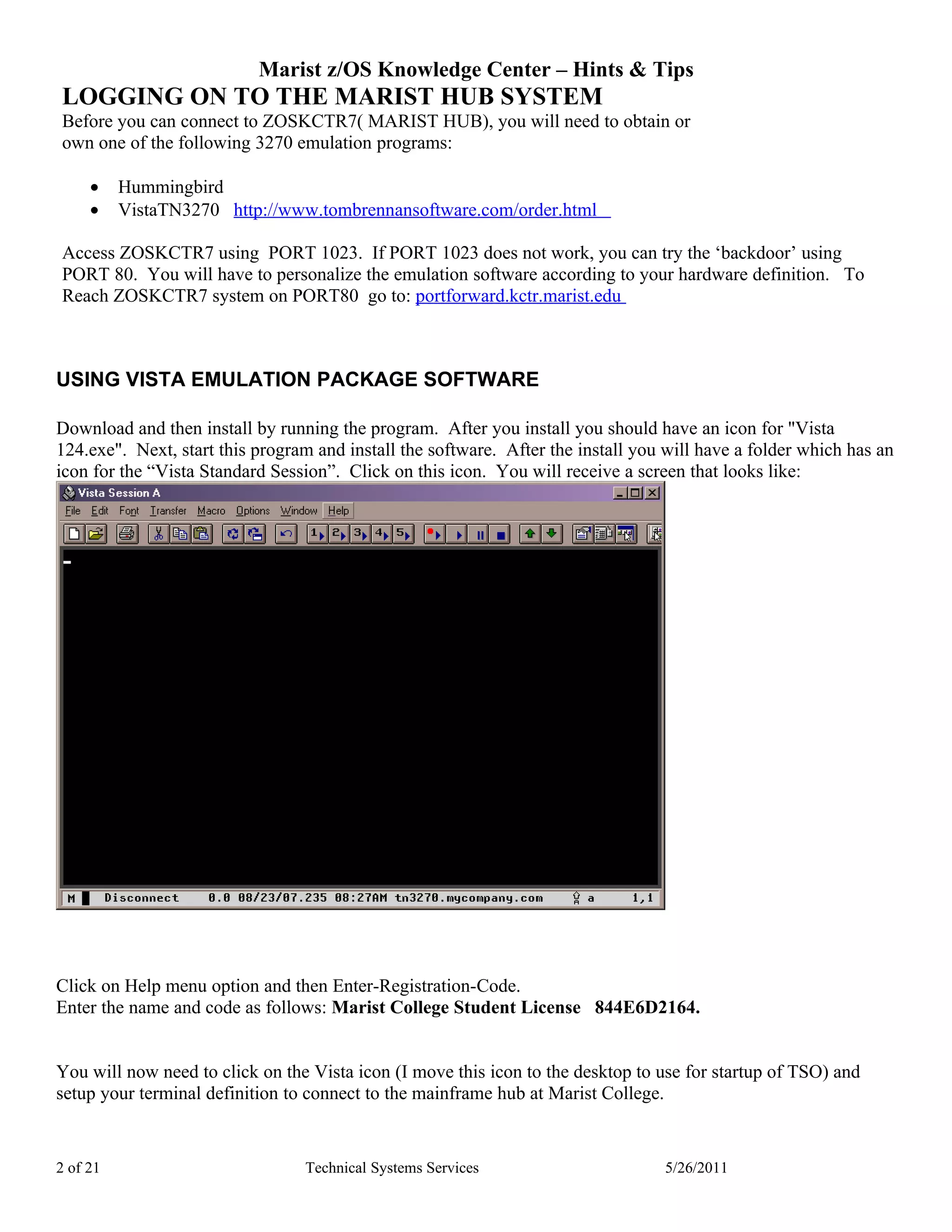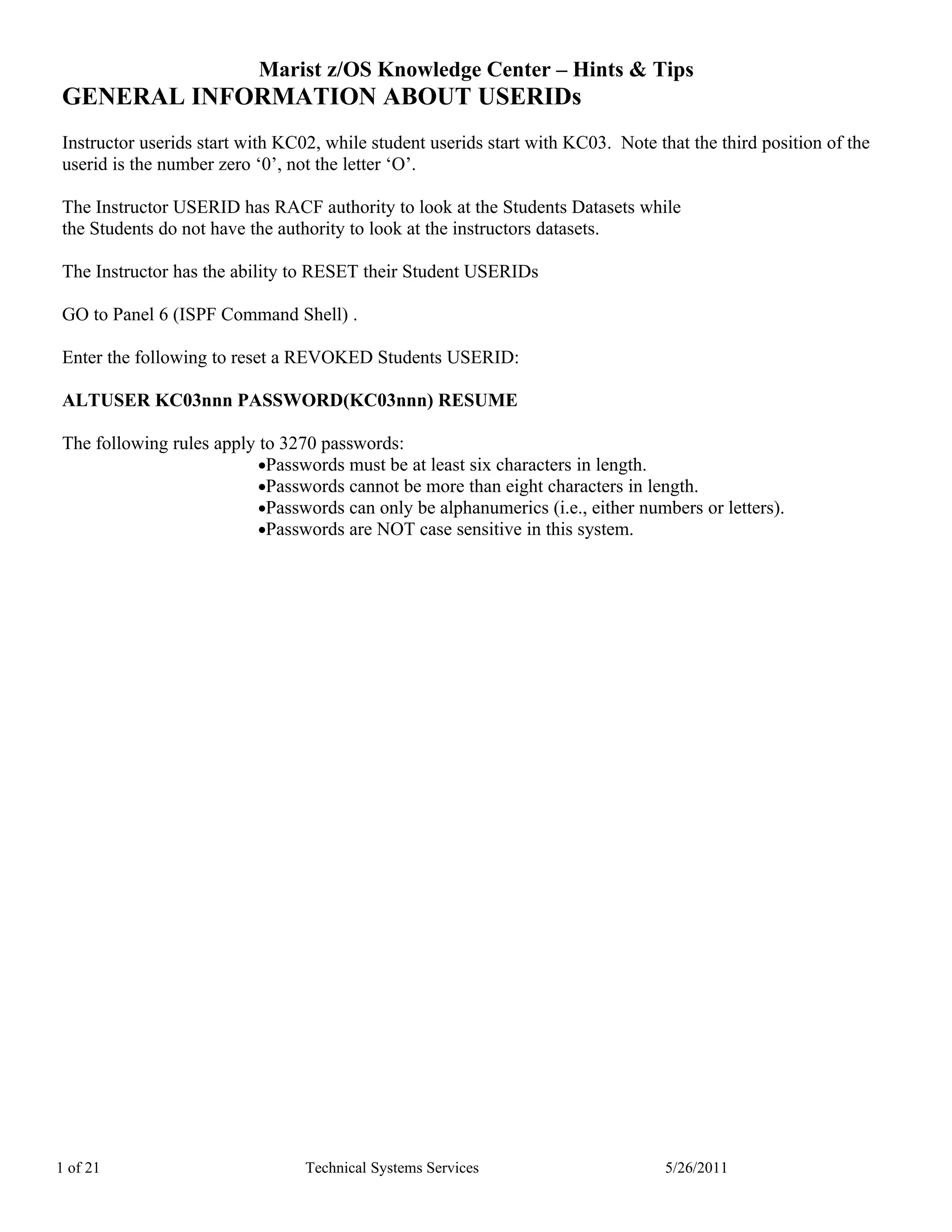 The document provides information about user IDs, passwords, and connecting to the Marist z/OS system. Instructor user IDs start with KC02 while student IDs start with KC03. The instructor can reset student user IDs and view student datasets, while students cannot view instructor datasets. The document describes how to connect using emulation software, sign on to TSO, edit keyboard settings, purge output, log off, and look up ABEND codes.