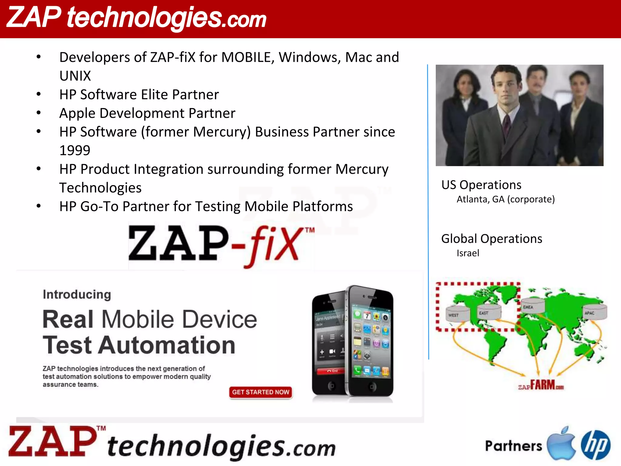 ZAP-fiX (ZPX) is a software solution that uses emulators and real devices to enable automated and manual cross-platform testing of mobile, desktop, and web applications on Windows, Mac, and Unix platforms. It integrates with HP test automation and management products like QuickTest Pro, LoadRunner, and Quality Center to provide device emulation and remote testing capabilities. ZPX is offered through various licensing models and provides training, support portals, and maintenance for its HP software integrations.