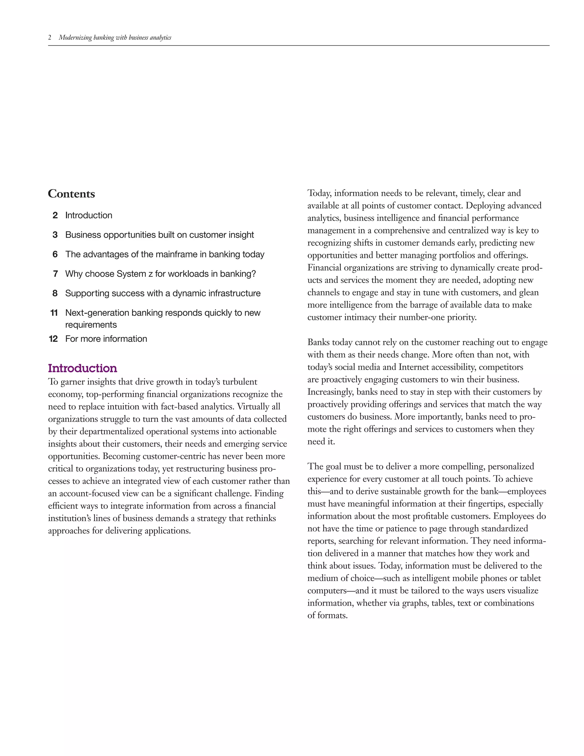 The document discusses how banks can modernize their operations using business analytics to better understand customer behaviors and enhance profitability. It emphasizes the importance of a centralized information system, particularly through the adoption of IBM's mainframe technologies, to integrate customer data and improve decision-making processes. The paper also highlights the need for real-time information delivery and analytics to foster stronger customer relationships and adapt quickly to market changes.