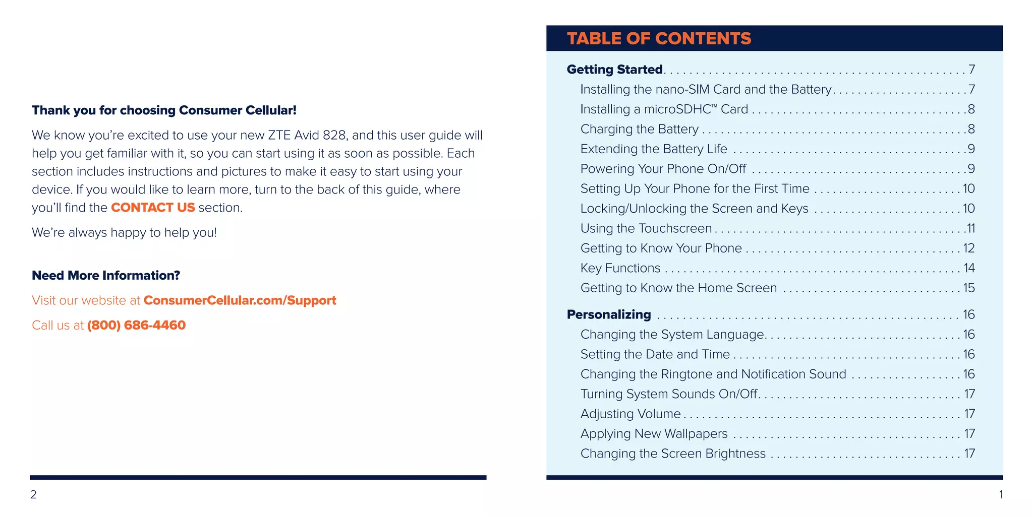 The document is a user guide for the ZTE Avid 828 phone. It includes sections for getting started with the phone, personalizing settings, making calls, connecting to networks and devices, and more. The guide provides instructions and pictures to help users start using their new phone's basic and advanced features.