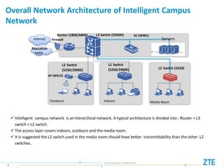 The document discusses network solutions and products for intelligent campus networks. It describes a typical network architecture including routers, L3 switches, and L2 switches. It then provides details on specific network products like the ZXR10 5950H L3 switch, ZXR10 1800 router, ZXR10 2900E and 5250 L2 switches, ZXWL W981s AC, and ZXV10 W615 AP. Finally, it briefly describes some ZTE network projects including an education network in Mozambique and a university network project in Indonesia.
