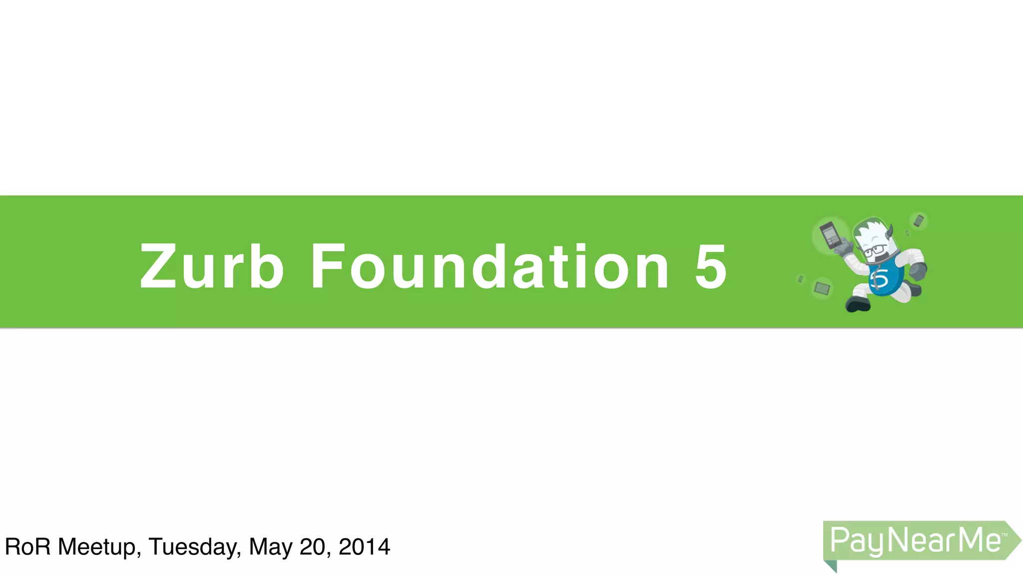 Zurb Foundation 5 is a front-end framework for building responsive web pages that integrates easily with Ruby on Rails applications. It provides a grid system, global styles, and prebuilt components to quickly design pages, as well as Sass, JavaScript widgets, and simple configuration. Developers can add Foundation to a Rails app by adding the foundation-rails gem, running bundle install, and generating the Foundation install files.