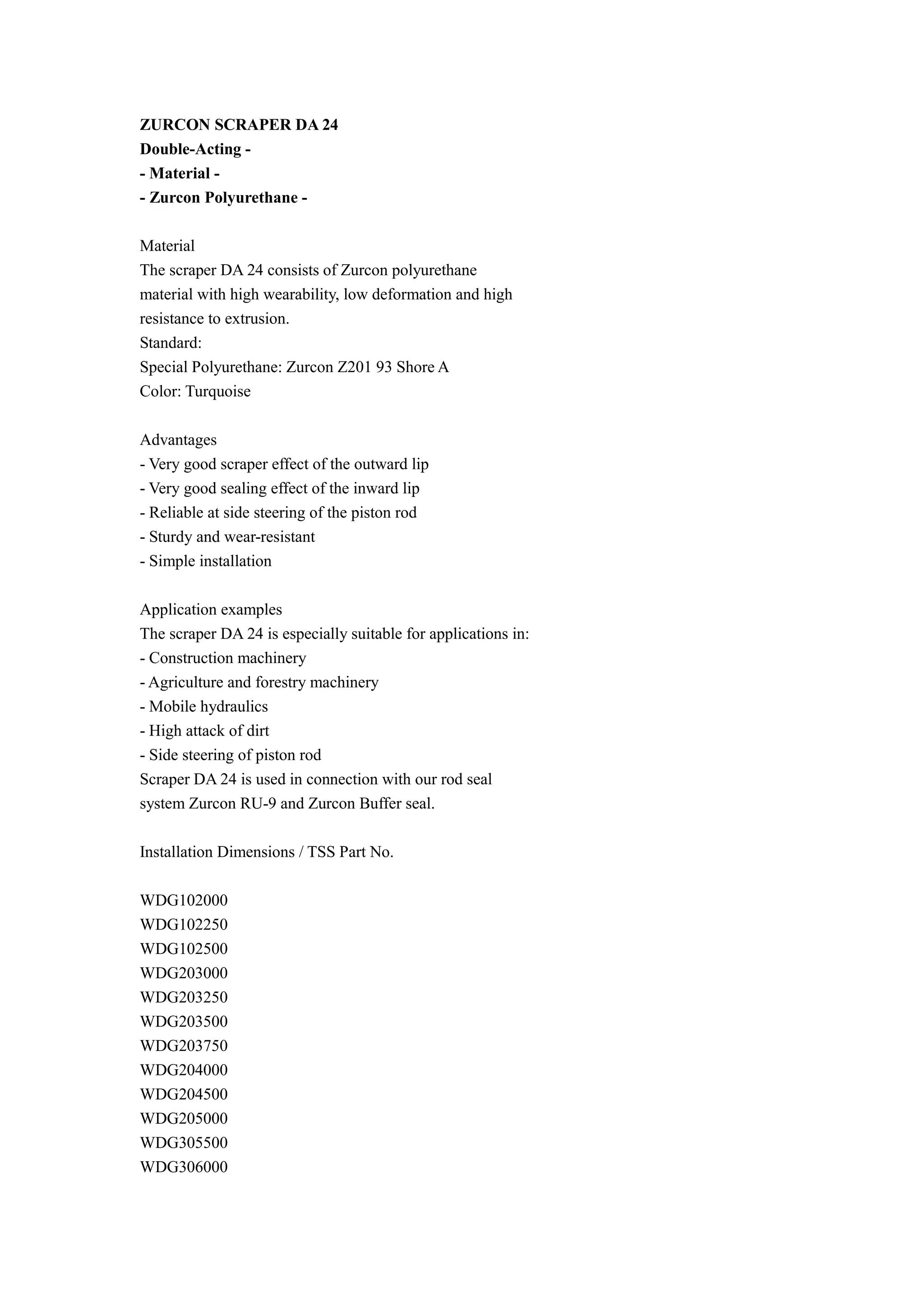 The Zurcon scraper DA 24 is a double-acting scraper made from Zurcon polyurethane material. It has high wear resistance, low deformation, and resistance to extrusion. It provides very good sealing and scraping effects for construction, agriculture, forestry, and mobile hydraulics applications where there is high dirt attack and side steering of the piston rod. The scraper works together with Zurcon's RU-9 rod seal system and buffer seal, and is available in a variety of installation dimensions.