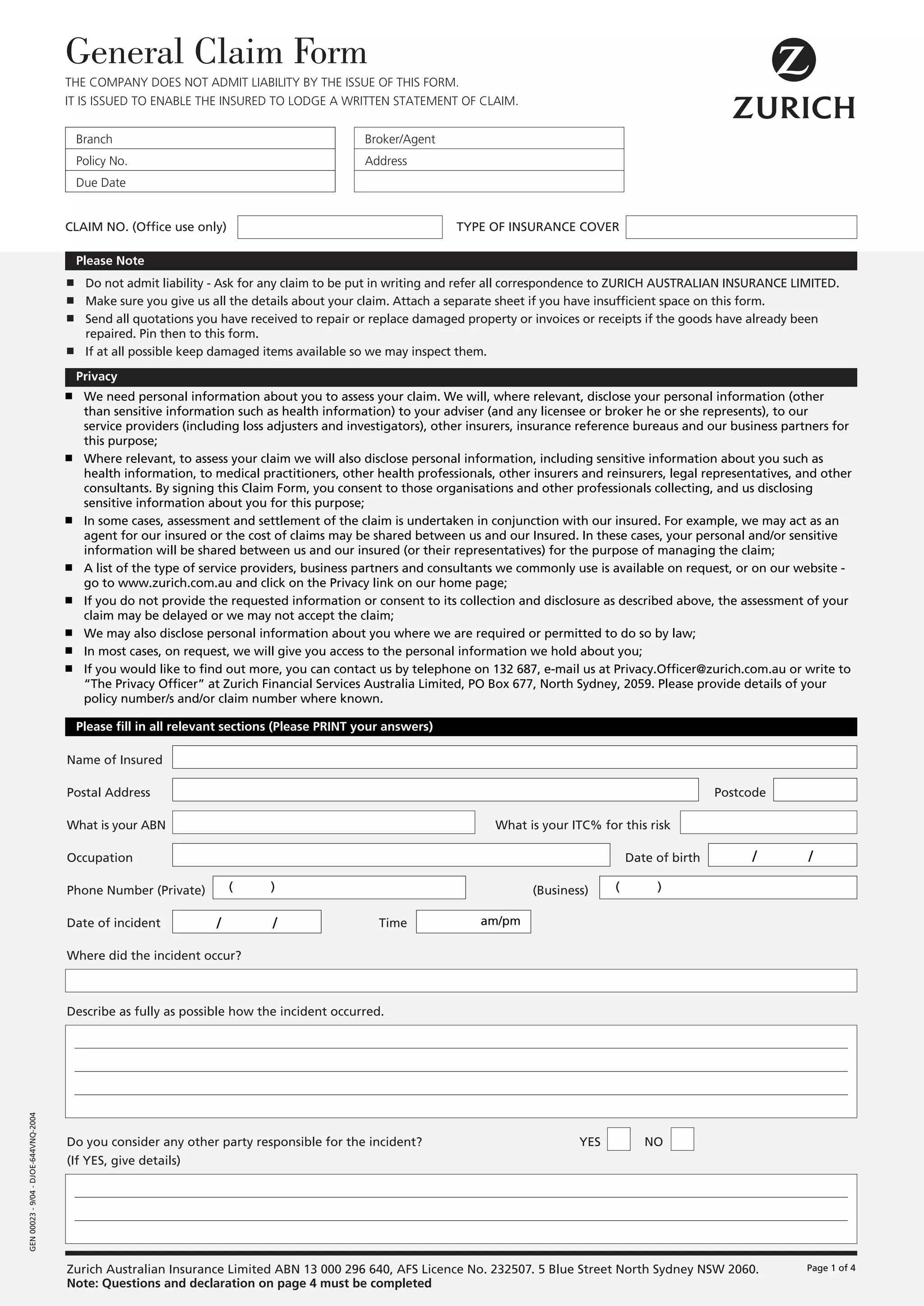 The document is a general claim form from an insurance company. It requests information to process an insurance claim, including details of: