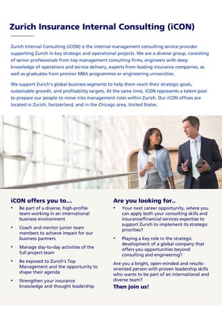 Zurich Insurance Internal Consulting (iCON) provides internal consulting services to Zurich Insurance to support key strategic and operational projects. iCON is seeking applicants with consulting, insurance, or financial services expertise to join their diverse international team. Successful candidates will help Zurich achieve strategic goals and support business partners, while also advancing their own careers within Zurich Insurance. The document describes iCON's services, open career opportunities from consultant to principal levels, and provides contact information for applicants to submit resumes.