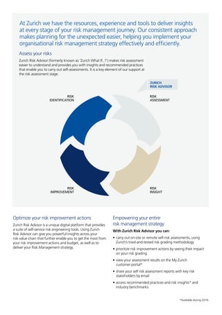 Zurich Risk Advisor is a digital platform that provides risk assessment and management tools. It allows users to conduct self-assessments of risks using Zurich's methodology, prioritize risk improvement actions, and access industry benchmarks. The platform provides insights into risks across an organization's risk value chain to help optimize risk management strategy and budget.
