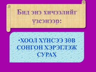2. Цагаар хооллож сураарай. (өглөө, өдөр, үд дунд, орой)