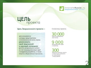 Документ описывает проект Зворыкинской премии, цель которого заключается в реализации инновационных идей и проектов молодыми участниками, а также получении ими грантов и общественного признания. Основные мероприятия включают конкурс «Заказ инноваций», стартап-тур и инновационный конвент, направленные на поддержку и развитие молодых инноваторов. Проект также способствует партнерству между молодежными командами и промышленными компаниями для совместной работы над реальными задачами и коммерциализацией идей.