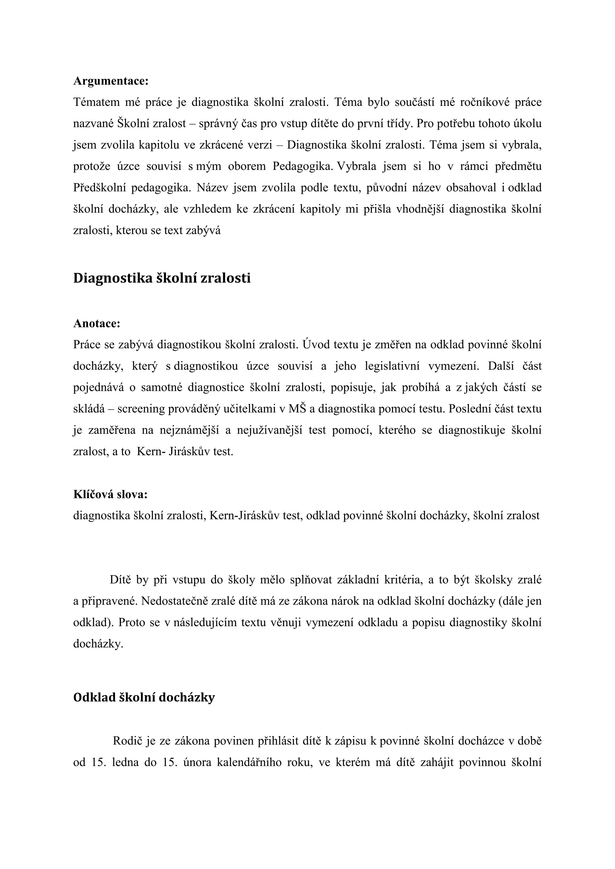 jsem zvolila kapitolu ve zkrácené verzi – Diagnostika školní zralosti. Téma jsem si vybrala,