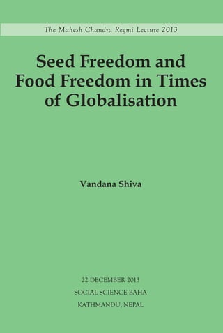 This document is Vandana Shiva's lecture on "Seed Freedom and Food Freedom in Times of Globalisation" given in Kathmandu, Nepal in 2013. She argues that corporate globalization, through free trade agreements and laws, aims to establish corporate rule by destroying people's freedoms, especially their freedom over seeds and food. This is done through privatizing seeds via patents and intellectual property laws, deregulating environmental and health protections, and shifting public funds towards corporate welfare from public welfare. She advocates for defending people's freedoms through practices like seed sovereignty and satyagraha resistance against unjust laws criminalizing traditional seed sharing.