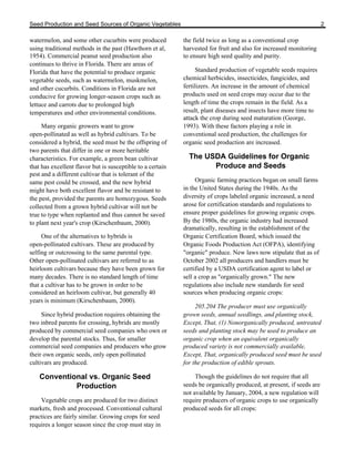 The document discusses the growing demand for organic vegetables and seed production, highlighting the transition towards certified organic seed sources due to new regulations. It outlines the environmental conditions suitable for organic seed production in various U.S. states, detailing the methods, challenges, and practices necessary for successful organic seed farming. The report emphasizes the importance of using organically grown seeds, the proper management of soil and pests, and the adoption of sustainable farming practices for vegetable seed production.
