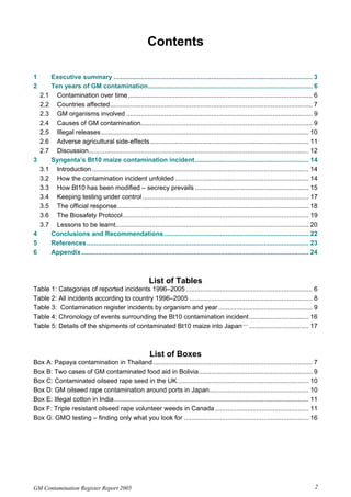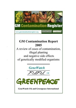 The 2005 GM Contamination Report by Genewatch UK and Greenpeace reviews contamination cases, illegal plantings, and negative agricultural effects related to genetically modified organisms (GMOs) from 1996 to 2005, with 113 incidents reported in total. The report highlights issues such as ineffective controls, illegal sales of GM crops, and the need for independent monitoring and transparency regarding GMO releases. Urgent recommendations include establishing an international commission for investigation and stricter regulations to prevent future contamination and protect public interests.