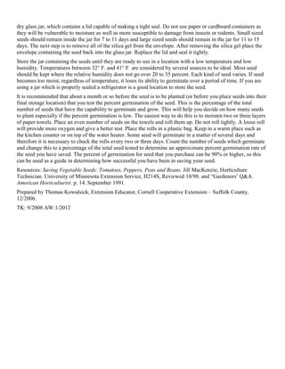 This document provides instructions for saving vegetable seeds from home gardens. It explains that seeds from crops like tomatoes, peppers, beans and peas can easily be saved as they have self-pollinating flowers. However, seeds from biennial crops and plants with separate male and female flowers may cross-pollinate, so seed purity is difficult to maintain. The document recommends choosing open-pollinated rather than hybrid varieties, collecting seeds from high-quality mature plants, drying and storing seeds properly with silica gel in an airtight glass container in the refrigerator. It also suggests testing seed germination rates before planting.