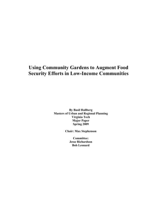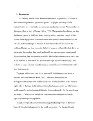 The document discusses the issue of food insecurity in low-income communities in the U.S., highlighting that hunger is not due to insufficient food production but rather to inadequate distribution and income disparities. It emphasizes the role of community gardens as a vital tool to improve access to nutritious food, while also showcasing successful municipal efforts in cities like Philadelphia and Toronto. The text examines the multifaceted nature of food insecurity and the need for comprehensive local government actions to tackle the issue effectively.