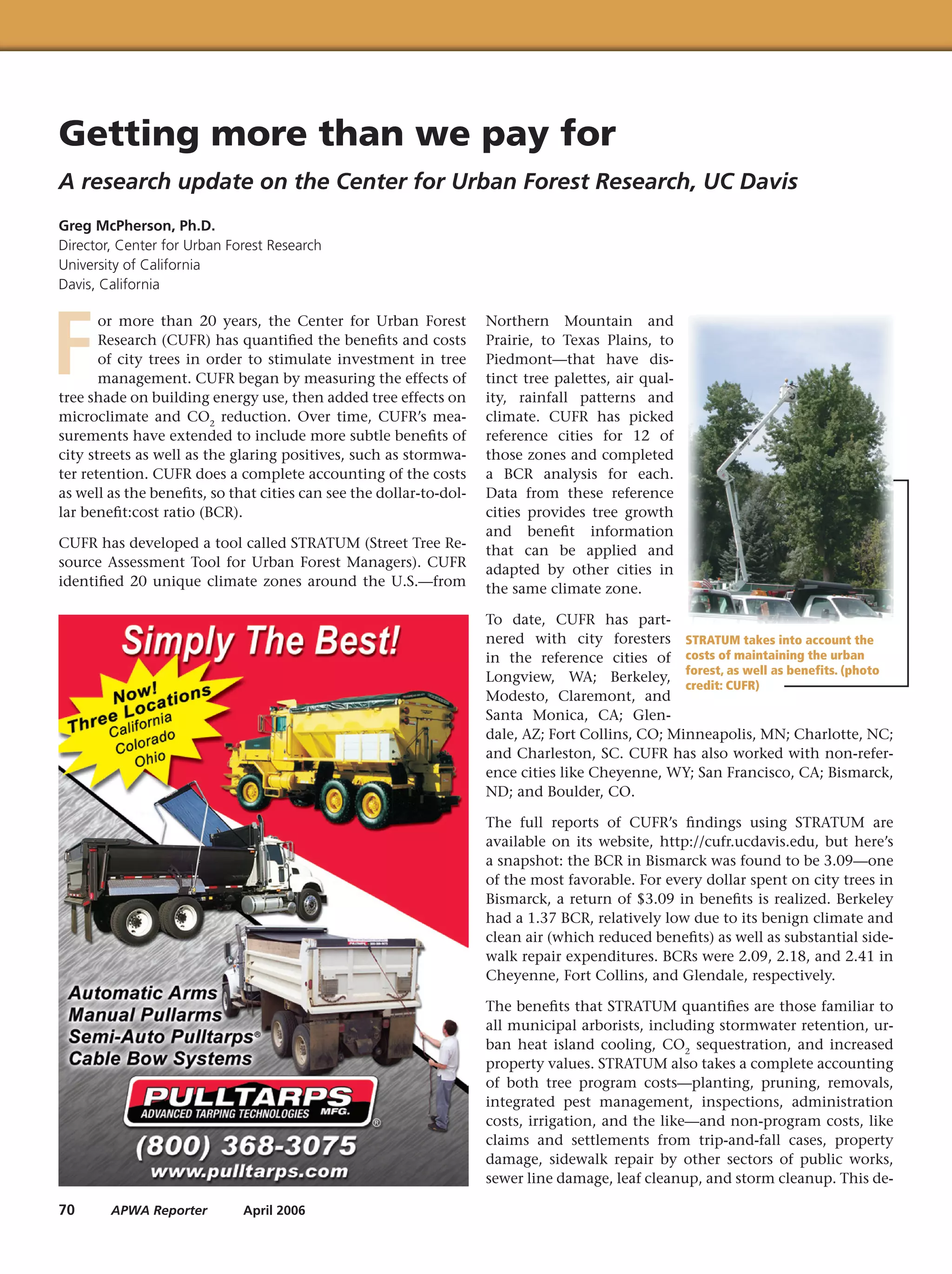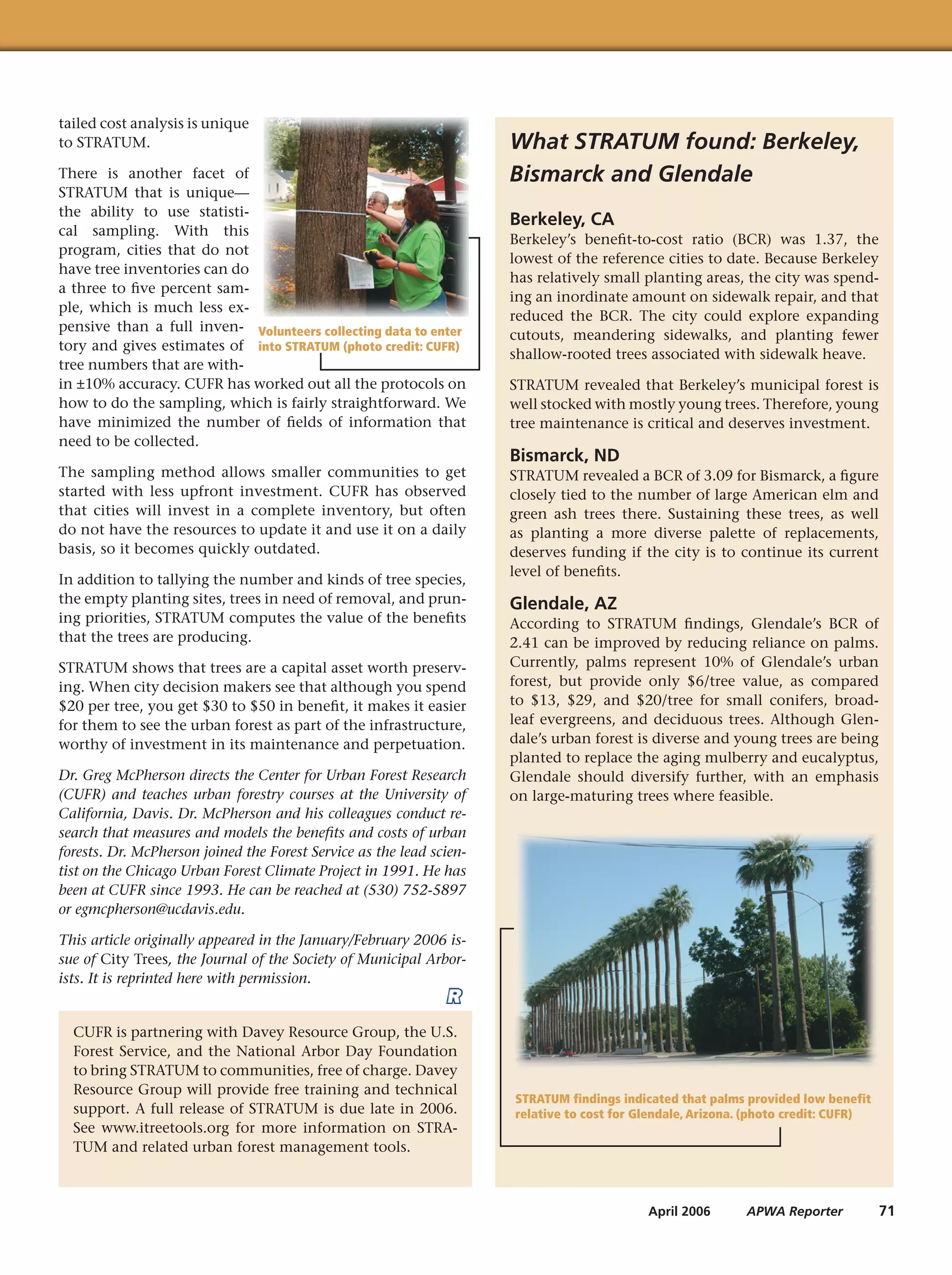 The Center for Urban Forest Research (CUFR) has developed the Stratum tool to analyze the benefits and costs of urban trees, enabling cities to understand the dollar-to-dollar benefit-cost ratio (BCR) for tree management. Findings indicate significant variations in BCR across different cities, with Bismarck reporting the highest at 3.09, emphasizing the need for cities to effectively manage and invest in their urban forests. Stratum also allows cities without comprehensive tree inventories to utilize statistical sampling for cost-effective assessments of their urban forestry assets.