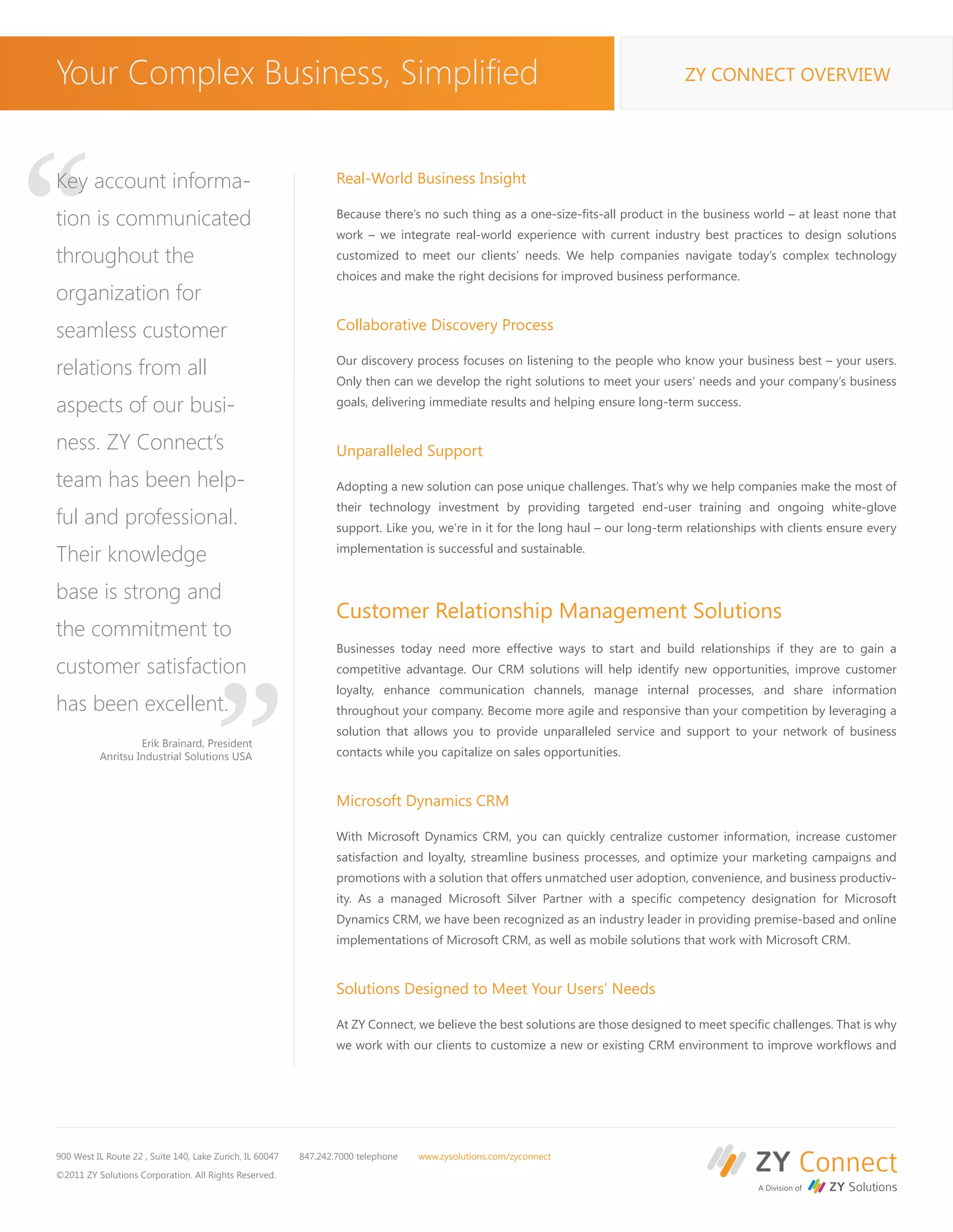 ZY Connect specializes in designing and implementing business management strategies and solutions to help companies stay connected across departments. Their solutions include customer relationship management, mobile CRM, collaboration tools, integration of various data sources, and automation of business processes. They have experience implementing Microsoft technologies like Dynamics CRM and SharePoint. Clients praise their expertise, customized approaches, ongoing support, and abilities to improve productivity and efficiency through data-driven solutions.