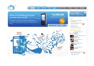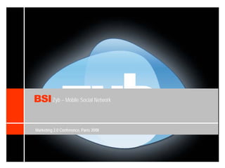 BSI Zyb is a mobile social network that allows users to store and manage contacts, connect with friends, and receive live updates directly on their phones. The network utilizes the phone's existing phonebook and turns it into a social graph by connecting users to online social communities and services. Zyb can be configured on almost any phone from any operator anywhere through a simple online application and over-the-air configuration with just three clicks on the phone. The network aims to answer questions about a user's current location, activities, and availability through its next generation phonebook interface that provides a plug-and-play social experience.