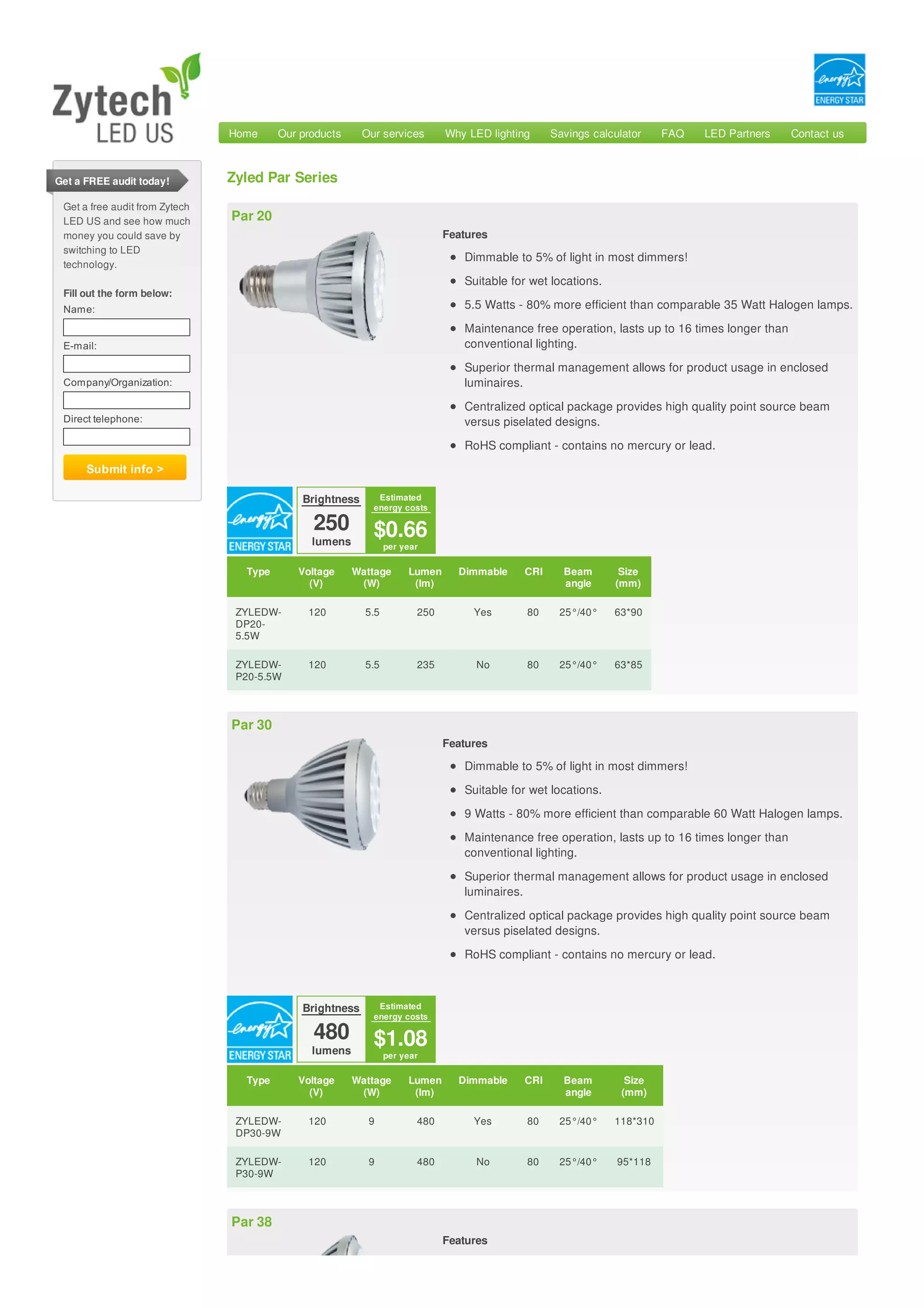 The document promotes Zytech LED's PAR series lighting products which offer significant energy savings and long operational life compared to traditional halogen lamps. It highlights features such as dimmability, suitability for wet locations, and compliance with environmental standards. Additionally, the company offers free audits to assess potential savings from switching to LED lighting.