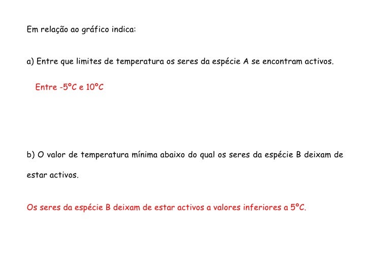 10. 10. <ul><ul><ul><ul><ul><li>Em relação ao gráfico indica: </li></ul></ul></ul></ul></ul><ul><ul><ul><ul><ul><li>a) Entre que limites de temperatura os seres da espécie A se encontram activos. </li></ul></ul></ul></ul></ul><ul><ul><ul><ul><ul><li>Entre -5ºC e 10ºC </li></ul></ul></ul></ul></ul><ul><ul><ul><ul><ul><li>b) O valor de temperatura mínima abaixo do qual os seres da espécie B deixam de estar activos. </li></ul></ul></ul></ul></ul><ul><ul><ul><ul><ul><li>Os seres da espécie B deixam de estar activos a valores inferiores a 5ºC. </li></ul></ul></ul></ul></ul>