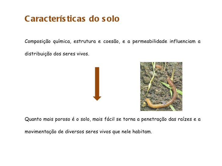 100. 100. Composição química, estrutura e coesão, e a permeabilidade influenciam a distribuição dos seres vivos. Quanto mais poroso é o solo, mais fácil se torna a penetração das raízes e a movimentação de diversos seres vivos que nele habitam. Características do solo