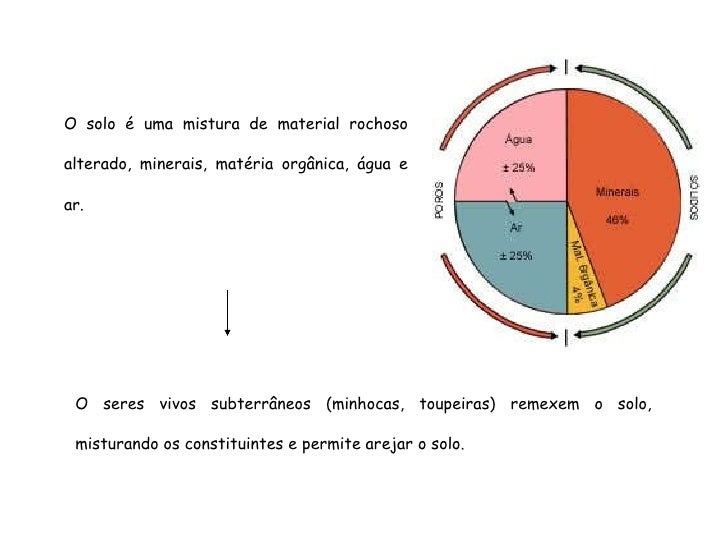 101. 101. O solo é uma mistura de material rochoso alterado, minerais, matéria orgânica, água e ar. O seres vivos subterrâneos (minhocas, toupeiras) remexem o solo, misturando os constituintes e permite arejar o solo.