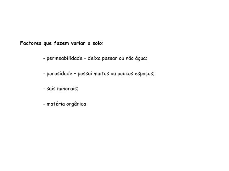 102. 102. Factores que fazem variar o solo : - permeabilidade – deixa passar ou não água; - porosidade – possui muitos ou poucos espaços; - sais minerais; - matéria orgânica
