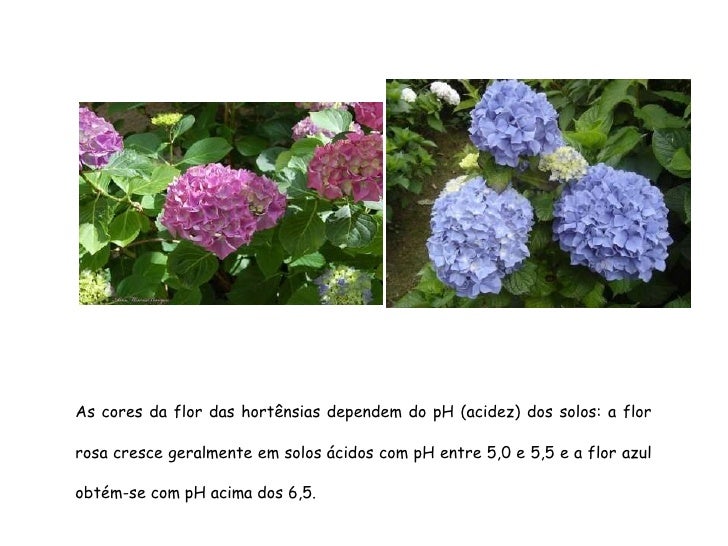 103. 103. As cores da flor das hortênsias dependem do pH (acidez) dos solos: a flor rosa cresce geralmente em solos ácidos com pH entre 5,0 e 5,5 e a flor azul obtém-se com pH acima dos 6,5.