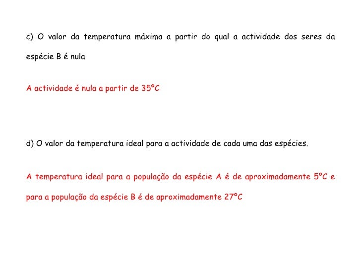 11. 11. <ul><ul><ul><ul><ul><li>c) O valor da temperatura máxima a partir do qual a actividade dos seres da espécie B é nula </li></ul></ul></ul></ul></ul><ul><ul><ul><ul><ul><li>A actividade é nula a partir de 35ºC </li></ul></ul></ul></ul></ul><ul><ul><ul><ul><ul><li>d) O valor da temperatura ideal para a actividade de cada uma das espécies. </li></ul></ul></ul></ul></ul><ul><ul><ul><ul><ul><li>A temperatura ideal para a população da espécie A é de aproximadamente 5ºC e para a população da espécie B é de aproximadamente 27ºC </li></ul></ul></ul></ul></ul>