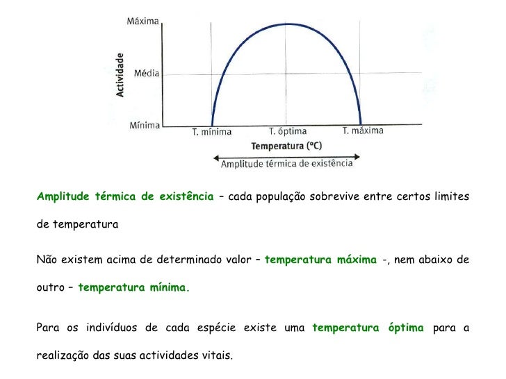 13. 13. <ul><ul><ul><ul><ul><li>Amplitude térmica de existência – cada população sobrevive entre certos limites de temperatura </li></ul></ul></ul></ul></ul><ul><ul><ul><ul><ul><li>Não existem acima de determinado valor – temperatura máxima -, nem abaixo de outro – temperatura mínima. </li></ul></ul></ul></ul></ul><ul><ul><ul><ul><ul><li>Para os indivíduos de cada espécie existe uma temperatura óptima para a realização das suas actividades vitais. </li></ul></ul></ul></ul></ul>