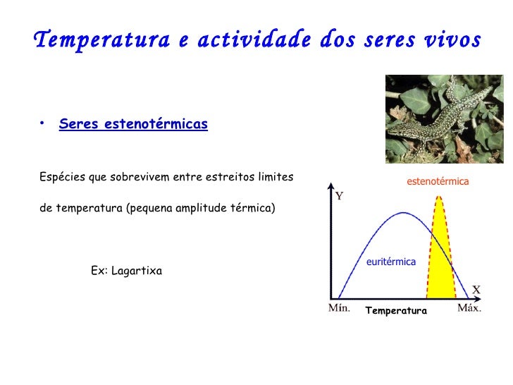 14. 14. Temperatura e actividade dos seres vivos <ul><li>Seres estenotérmicas </li></ul><ul><li>Espécies que sobrevivem entre estreitos limites </li></ul><ul><li>de temperatura (pequena amplitude térmica) </li></ul><ul><li>Ex: Lagartixa </li></ul>euritérmica estenotérmica Temperatura