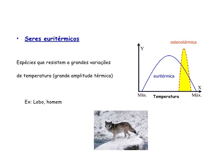 15. 15. <ul><li>Seres euritérmicos </li></ul><ul><li>Espécies que resistem a grandes variações </li></ul><ul><li>de temperatura (grande amplitude térmica) </li></ul><ul><li>Ex: Lobo, homem </li></ul>euritérmica estenotérmica Temperatura