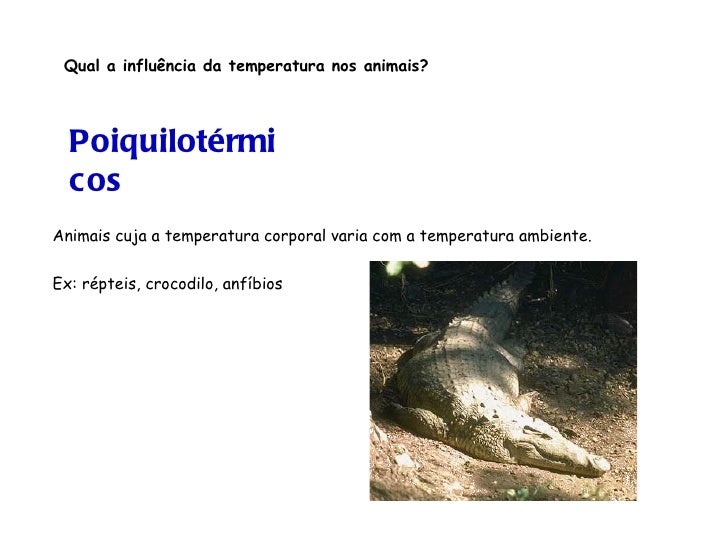 17. 17. Qual a influência da temperatura nos animais? <ul><ul><ul><ul><ul><li>Animais cuja a temperatura corporal varia com a temperatura ambiente. </li></ul></ul></ul></ul></ul><ul><ul><ul><ul><ul><li>Ex: répteis, crocodilo, anfíbios </li></ul></ul></ul></ul></ul>Poiquilotérmicos