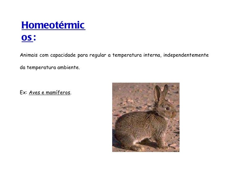18. 18. Animais com capacidade para regular a temperatura interna, independentemente da temperatura ambiente. Ex: Aves e mamíferos . Homeotérmicos :