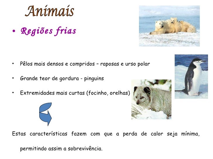 20. 20. <ul><li>Regiões frias </li></ul><ul><li>Pêlos mais densos e compridos – raposas e urso polar </li></ul><ul><li>Grande teor de gordura - pinguins </li></ul><ul><li>Extremidades mais curtas (focinho, orelhas) </li></ul><ul><li>Estas características fazem com que a perda de calor seja mínima, permitindo assim a sobrevivência. </li></ul>Animais