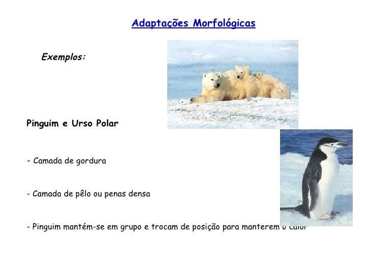 21. 21. Adaptações Morfológicas Exemplos: Pinguim e Urso Polar - Camada de gordura - Camada de pêlo ou penas densa - Pinguim mantém-se em grupo e trocam de posição para manterem o calor