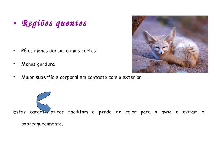 22. 22. <ul><li>Regiões quentes </li></ul><ul><li>Pêlos menos densos e mais curtos </li></ul><ul><li>Menos gordura </li></ul><ul><li>Maior superfície corporal em contacto com o exterior </li></ul><ul><li>Estas características facilitam a perda de calor para o meio e evitam o sobreaquecimento. </li></ul>