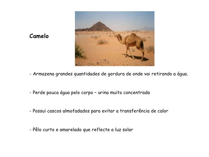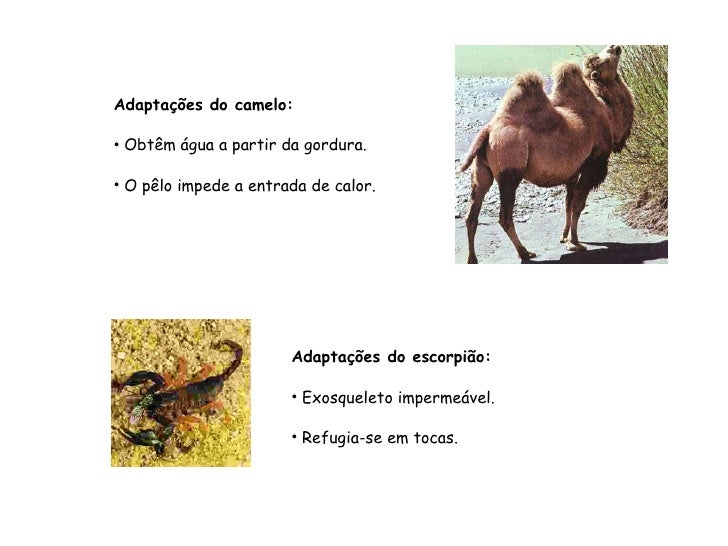 91. 91. <ul><li>Adaptações do camelo: </li></ul><ul><li>Obtêm água a partir da gordura. </li></ul><ul><li>O pêlo impede a entrada de calor. </li></ul><ul><li>Adaptações do escorpião: </li></ul><ul><li>Exosqueleto impermeável. </li></ul><ul><li>Refugia-se em tocas. </li></ul>